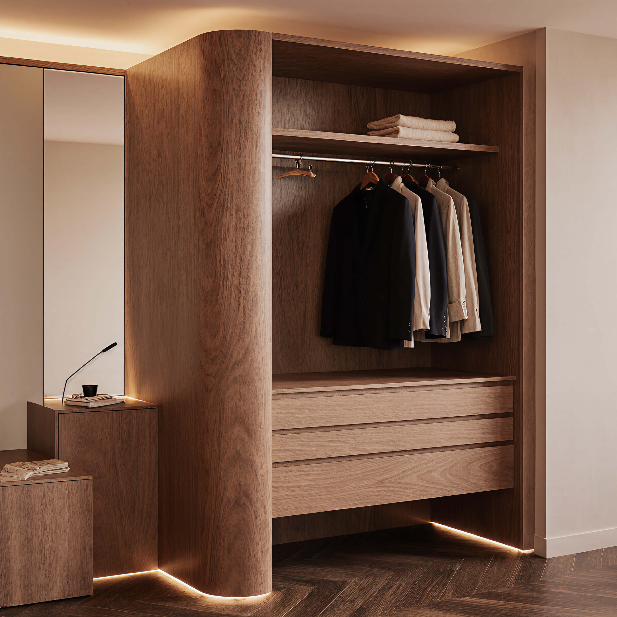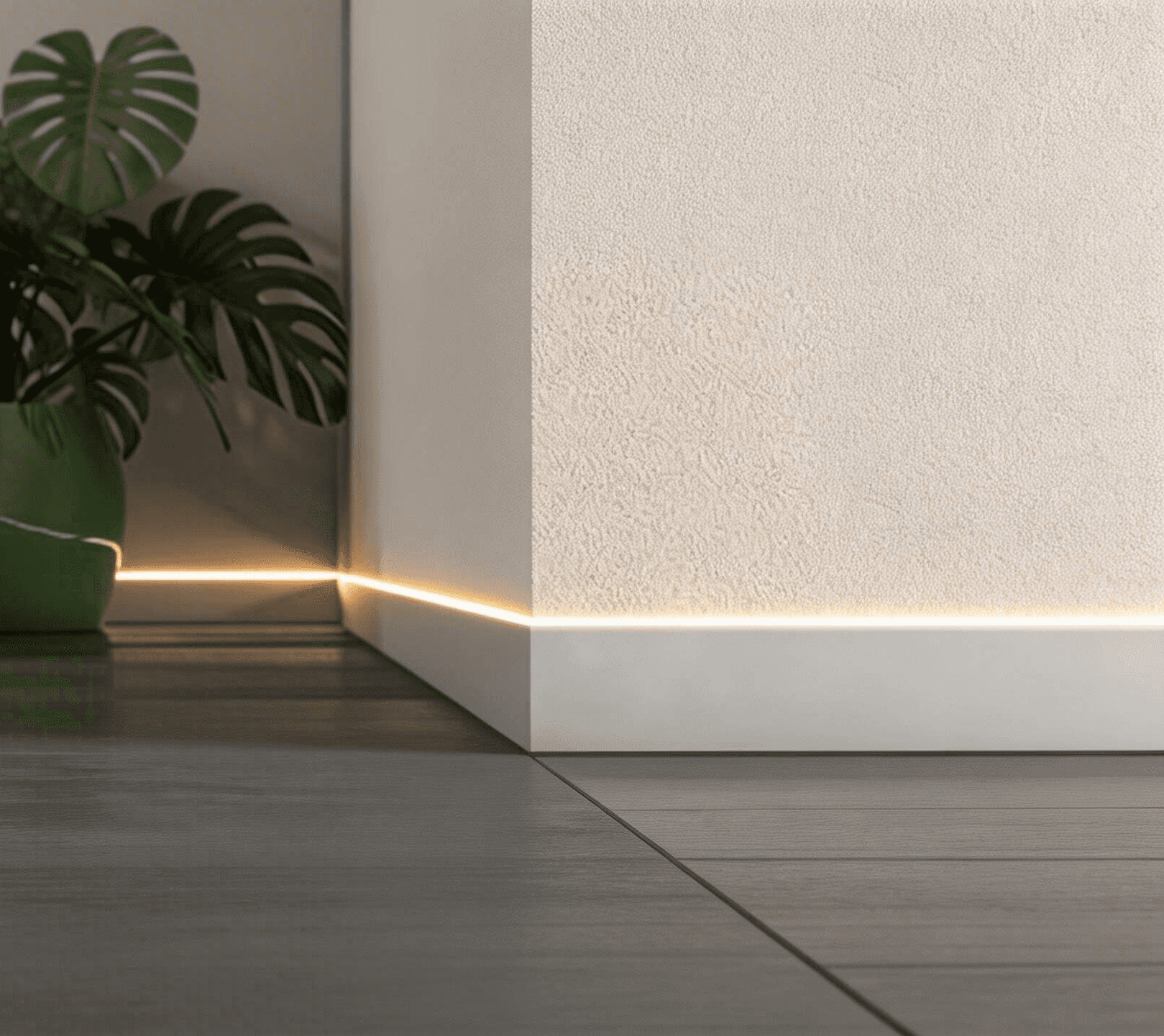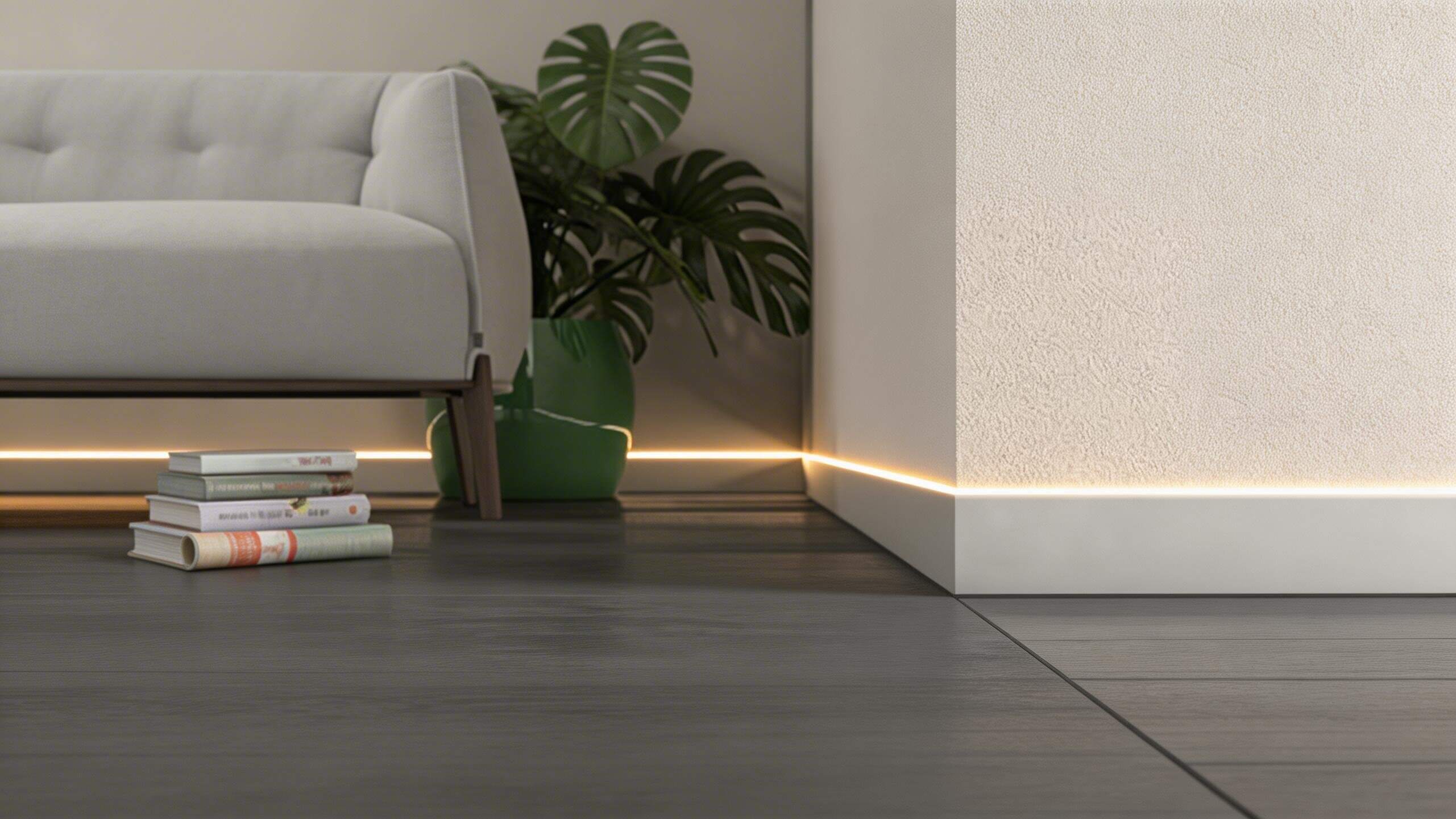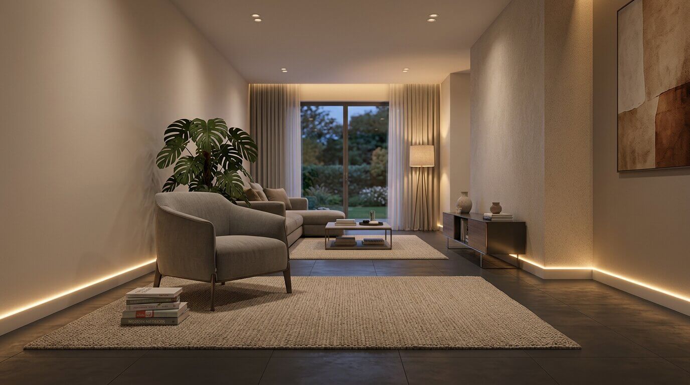 透過專用型材將燈光整合於牆地交界,取代傳統踢腳線,鋁合金散熱反射打造懸浮視覺,同步提升夜間行走的指引安全性。